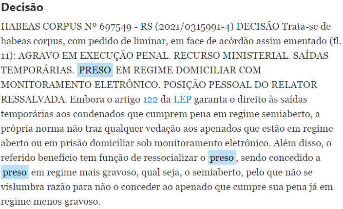 Fonte: https://stj.jusbrasil.com.br/jurisprudencia/1307366968/habeas-corpus-hc-697549-rs-2021-0315991-4