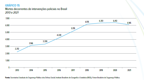 Observa-se do gráfico abaixo que o índice de mortes decorrentes de intervenções policiais vem crescendo desde 2013: