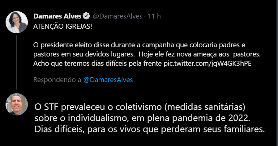 Damares Alves alardeia evangélicos e católicos sobre perseguição do "comunista". O "backlash" ou "contracontracultura" tomou força nos governos de Lula e Dilma, quando partidos de "direita" perderam, após séculos de dominação política, o poder de decisão nas urnas. Cogitações de uma Nova Constituição Federal. E como seria? Quais direitos civis e políticos continuariam no ordenamento pátrio? A união homoafetiva seria proibida no Brasil? A Marcha da Maconha e a Parada Gay seriam proibidas? Ou seriam permitidas somente em recintos fechados em vez de serem nas vias públicas? O Estatuto do Nascituro seria aprovado, os abortos de feto anencéfalo, por consequência de estrupo, a possibilidade de abortar até o trigésimo mês de gravides, risco de vida para a gestante proibidos? O Estado continuaria a ser laico não há religião oficial no Estado, como ocorreu na Constituição de 1824, no texto da norma do artigo 5° ou laicista (a tradição judaico-cristã como oficial do Estado e demais religiões proibidas, ou permitidas com os cultos sem exteriorizações?