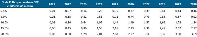 Em 2021, a despesa ficou entre R$ 0,1 a R$ 0,8 bilhão com o benefício. Em 2030, o gasto anual com o benefício ficaria entre R$ 0,46 bilhão a R$ 3,69 bilhões.