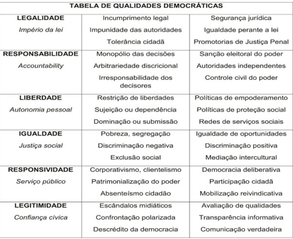 Nessa linha de raciocínio, com base no modelo de análise de Calvo (2010, p. 32- 44), são os seis fatores que necessitam ser observados para que se alcance a qualidade da democracia: a legalidade ou o império da lei; a responsabilidade ou accountability[1] (prestação de contas vertical e horizontal); o respeito às liberdades sociais e políticas ou à autonomia pessoal; a igualdade ou a justiça social (por meio da implementação de políticas públicas; a legitimidade ou a confiança cívica em relação à democracia.