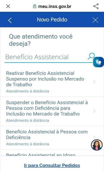 Passo 5 – Digite o benefício assistencial que deseja solicitar, no símbolo da “lupa” e clique no benefício que pretende requerer;