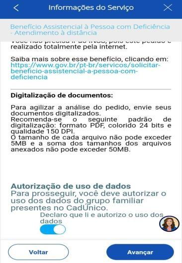 Passo 8 – Nessa etapa, é só anexar documentos pessoais, comprovante de residência, Cad-Único e documentos que comprovem a incapacidade da pessoa (laudos/ relatórios médicos, provas materiais de suas condições precárias) e assim avançar o pedido autorizando o uso de dados;