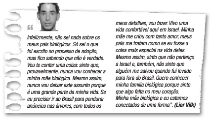 HISTÓRIA - O destino de Lior começou a ser traçado alguns meses antes, no verão de 1985, num país distante além do oceano, antes mesmo dele nascer. Um casal em Israel queria muito adotar uma criança, mas a espera pela adoção em seu país era muito demorada, cerca de sete anos ou mais. Através de amigos, ficaram sabendo que no Brasil era muito fácil de se adotar crianças e que havia uma senhora que intermediava adoções pelo mundo inteiro e foi assim que eles foram apresentados a Arlete Hilu, num hotel em Tel Aviv, Israel. Após o primeiro contato, estimulou-os a promessa de que teriam a criança em poucos dias e tudo foi preparado aparentemente de forma legal. O casal passou para ela e uma outra pessoa de nome Vilma Ferreira Oliveira, que se dizia advogada, uma procuração para que intermediassem a adoção de um menino no Brasil. Data da adoção da criança: 05/09/1985 Data de expedição do passaporte para Lior Vilk -- 16/setembro/1985 Saída do Brasil em companhia de Paulo Sergio Couto Ferreira, em 17/09/1985. No dia 21 de setembro de 1985, Lior, levado por Paulo Sergio Couto Ferreira, desembarca no Aeroporto de Israel junto com outros dois bebês. No saguão do aeroporto estavam, os pais adotivos de Lior, os pais adotivos das outras duas crianças, Arlete Hilu e o advogado Enrique Bazurra. Somente 25 anos mais tarde, Lior ficou sabendo que seus documentos foram falsificados e que o nome e demais dados constantes nos papéis de adoção, provavelmente também sejam falsos. A BUSCA - Já adulto, Lior decide sair em busca do seu passado, pois desde pequenino seus pais adotivos contavam que ele tinha nascido no Brasil o que fez crescer nele um grande sonho: encontrar sua mãe biológica! O desejo de conhecer sua história, a história da sua família biológica fica cada vez mais forte e em seus sonhos imagina que possa ter irmãos ou irmãs. Começa então a escrever cartas para vários órgãos do governo brasileiro, para a Embaixada e à Secretaria dos Direitos Humanos. Em fevereiro de 2010, Lior tem a primeira surpresa. Em resposta a uma de suas cartas para a OAB/RJ ele é informado que: "Sr. Lior, Recebemos a sua mensagem e informamos que não temos nenhuma advogada inscrita com o nome de Vilma Ferreira Oliveira. A Sra. Vilma Ferreira Oliveira não consta como inscrita em nenhum Estado brasileiro." Em seguida a OAB/RJ, na Comissão de Direitos Humanos e Assistência Judiciária, através de e-mail informa a Lior: “Lior, recebi seu processo [...] Já entrei em contato com o 4 Oficio de Notas e sei que a Certidão de Escritura de Adoção realizada em 5/9/85 é falsa. Sei que o Tabelião responsável já faleceu e que o Técnico Judiciário que realizou a suposta escritura já foi afastado há muito tempo. Entrei em contato com a Circunscrição de Registro Civil e sei que a certidão realizada em 1/9/85 também é falsa e a Oficial que a realizou no cartório já foi afastada também há muito tempo. "Registro no. 898, livro A-403 fls.63 de 05/09/1985 não tem com seu nome. Seu registro é falso. O registro de nascimento com o seu número é de uma menina- fêmea de nome Daniele". Não sei ainda se o próprio Tribunal de Justiça poderia localizar estas pessoas afastadas a tanto tempo e vir a responsabilizá-las. [....] Em carta enviada à Embaixada Brasileira em Israel, retornaram mandando-o procurar os Direitos Humanos no Brasil. Outra carta foi enviada para a Secretaria dos Direitos Humanos, na Esplanada dos Ministérios da Presidência da República, informaram que não lidam com estas questões e mandaram procurar outro órgão.37