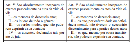 Primeiramente é importante observar o disposto nos artigos 3.º, 4.º e 5.º do Código Civil de 2002 (atualizado). O artigo 5.º prevê que a menoridade cessa aos 18 anos completos; o artigo 4.º, inciso III define como relativamente incapazes aqueles que, por causa transitória ou permanente, não puderem exprimir sua vontade.