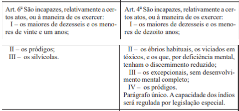 O Quadro a seguir mostra – à esquerda – a última redação do Código Civil de 1916 e – à direita – a primeira redação do Código Civil de 2002.
