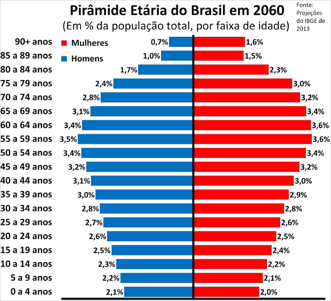 Esta pirâmide etária brasileira está de acordo com o Censo Demográfico, realizada pelo IBGE, ainda em 2010, mas será atualizada, com os novos dados do IBGE. Entretanto, mesmo assim, verifica-se que a estrutura populacional brasileira em 2060 acima de 50 anos será bem maior em relação número de jovens e crianças. Por isto, a advocacia previdenciarista é um excelente oportunidade de trabalho para nossos alunos recém formados.