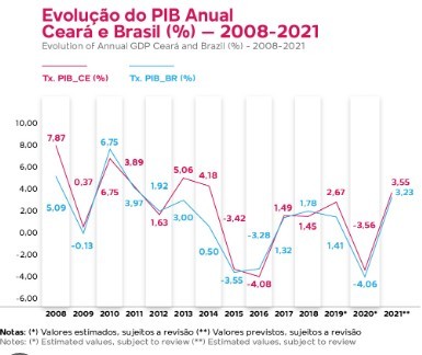 Como pode-se observar a evolução PIB de um período de 2008 a 2021 comparando-se o Brasil e o ceará, é perceptível que mesmo vindo de uma queda econômica do período de 2008 a 2016, a partir dai existindo uma estabilização, e partir do período de pandemia se iniciou uma reversão no movimento de queda, sendo esse um reflexo dos investimentos realizados.