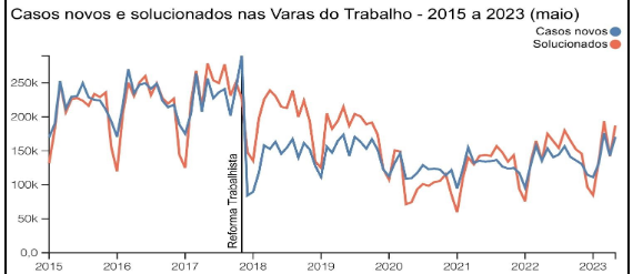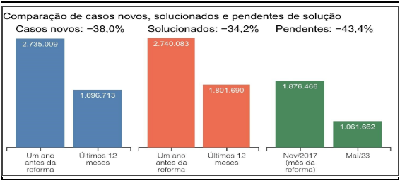 Essas questões refletem em peso no novo desenho da Justiça do Trabalho. Segundo dados do TST, comparando o número de ações trabalhistas (1ºgrau) antes e depois da Lei 13.467/2017, houve decréscimo expressivo de demandas após aprovação da mesma.
