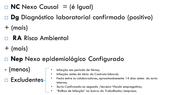 Assim, para fins de concessão de benefício no âmbito do Regime Geral de Previdência Social, em qualquer das hipóteses mencionadas, será a Perícia Médica Federal que deverá caracterizar tecnicamente a identificação do nexo entre o trabalho e o agravo, considerando a equação NC = (Dg + RA + Nep) – Excludentes, onde