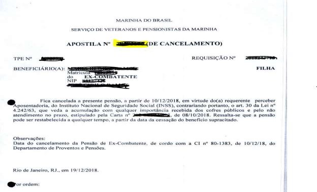 Mesmo diante disso, as Bases militares das Forças Armadas, da Marinha e das Forças Aéreas continuam cessando os benefícios aos dependentes de ex-combatentes, sob o fundamento de que seria impossível cumular a pensão com benefício previdenciário. Vejamos carta de cancelamento de pensão especial elaborada pela Marinha do Brasil, sob a justificativa de que a aposentadoria percebida pelo INSS não poderia ser cumulada com a pensão especial:
