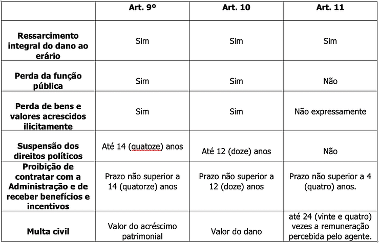 O quadro abaixo, traz as mudanças propostas pela Lei 14.230/2021, em que podemos vincular cada sanção legal ao tipo de ato de improbidade cometido: