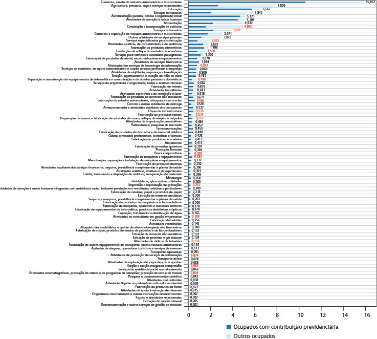 Distribui o total de 98,0 milhões de ocupados de 2022 entre os 87 setores a dois dígitos da CNAE Domiciliar, ordenados do maior para o menor. Os sete maiores setores definidos dessa forma concentram a maioria (52,4%) do total de ocupados no país. São eles: comércio, exceto de veículos automotores e motocicletas (15,9 milhões); agricultura, pecuária, caça e serviços relacionados (7,9 milhões); educação (6,6 milhões); serviços domésticos (5,8 milhões); administração pública, defesa e seguridade social (5,1 milhões); atividades de atenção à saúde humana (5,1 milhões); e alimentação (4,9 milhões).
