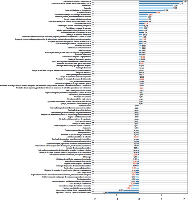 Entre os 87 setores analisados, 47 abriram mais vagas do que fecharam, respondendo juntos por 13,0 milhões de postos de trabalho adicionais. A maior parte desse acréscimo foi feita por quatro setores (52,3%): atividades de atenção à saúde humana (+2,0 milhões); comércio, exceto de veículos automotores e motocicletas (+1,8 milhão); alimentação (+1,5 milhão); e educação (+1,5 milhão).