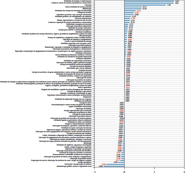 Do lado da contribuição positiva, mais da metade adveio de quatro setores (55,7%): atividades de atenção à saúde humana (+1,7 milhão); comércio, exceto de veículos automotores e motocicletas (+1,6 milhão); educação (+1,4 milhão); e outras atividades de serviços pessoais (+573 mil).