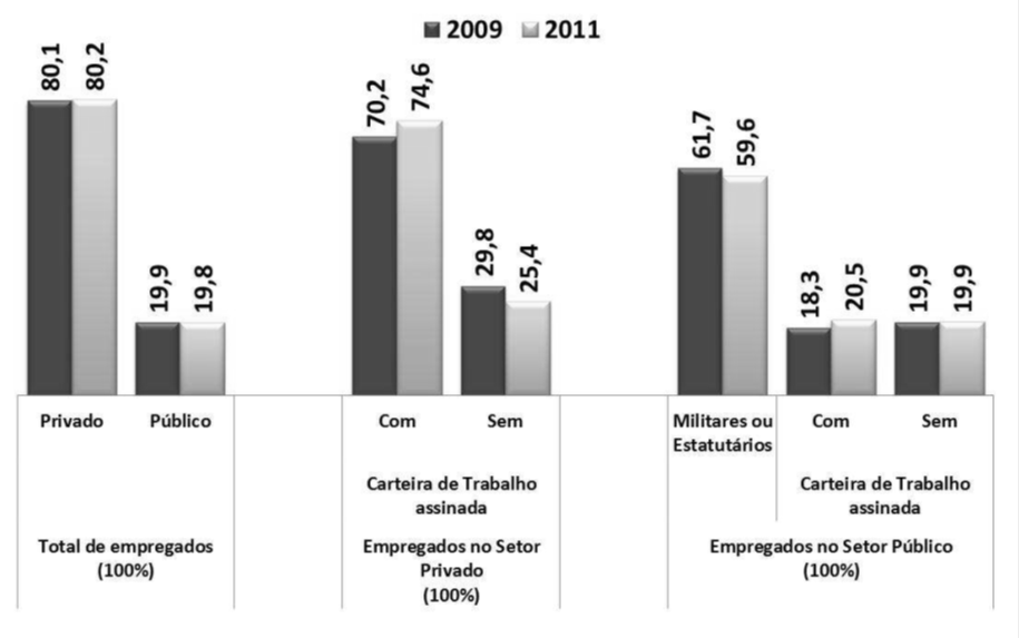 O gráfico a seguir distribuição de empregados, por setor público ou privado, com CTPS, esclarece que em 2011, 58,9% contribuíam para a previdência social.