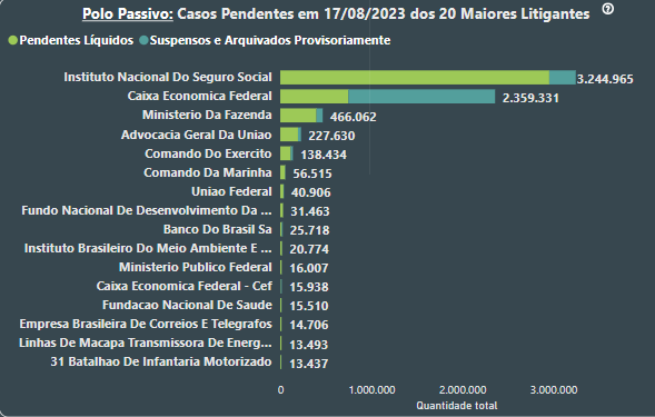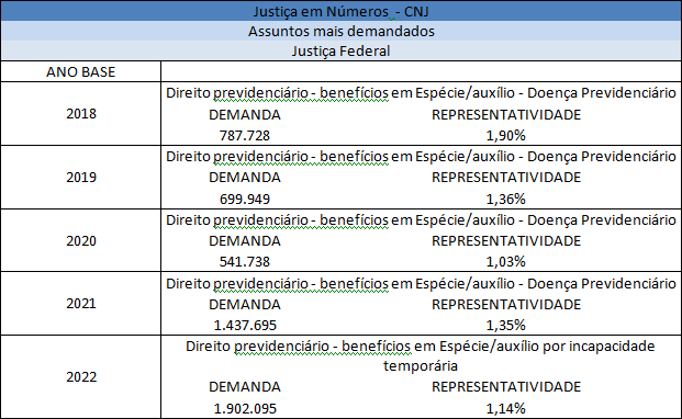No âmbito da Justiça Federal a autarquia se encontra como o maior litigante do país e teve significativa crescente na demanda pelo benefício no decorrer dos anos. O ano 2022 demonstrou o mais expressivo número de demandas aproximando de 2 milhões em todo cenário nacional, embora a representatividade das ações tenha diminuído, indicando maior procura da justiça, não apenas no contexto previdenciário, mas também para demais soluções de conflitos.