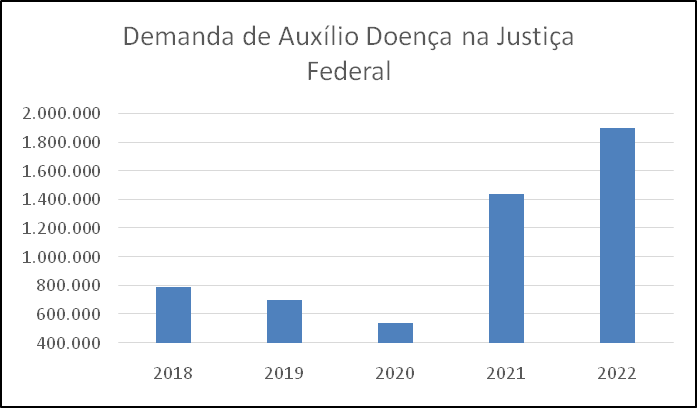 Uma análise proporcional revela que durante o período entre 2018 e 2022 ocorreu um aumento de 141,4%, na procura judicial pelo benefício por incapacidade temporária. O aumento correlaciona-se com o período da pandemia de Covid-19, no qual evidenciou-se uma crescente de 541.738 ações no ano de 2020 para 1.437.695 em 2021, apesar do significativo aumento da demanda a proporção de requerimento do auxílio previdenciário sofreu redução em relação ao total de processos na justiça Federal.