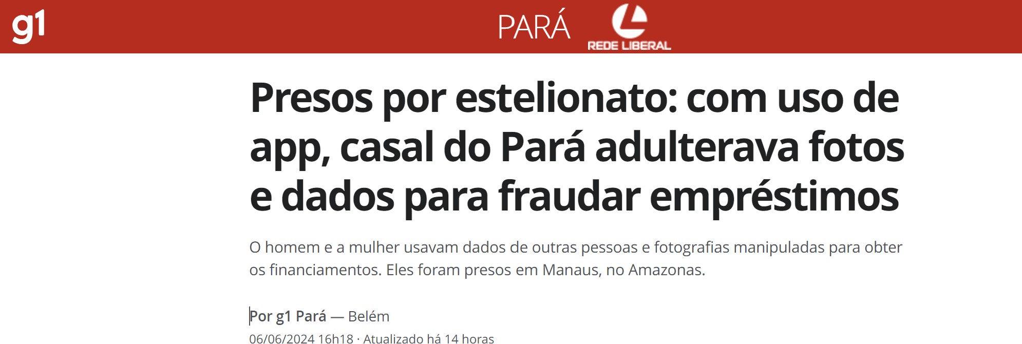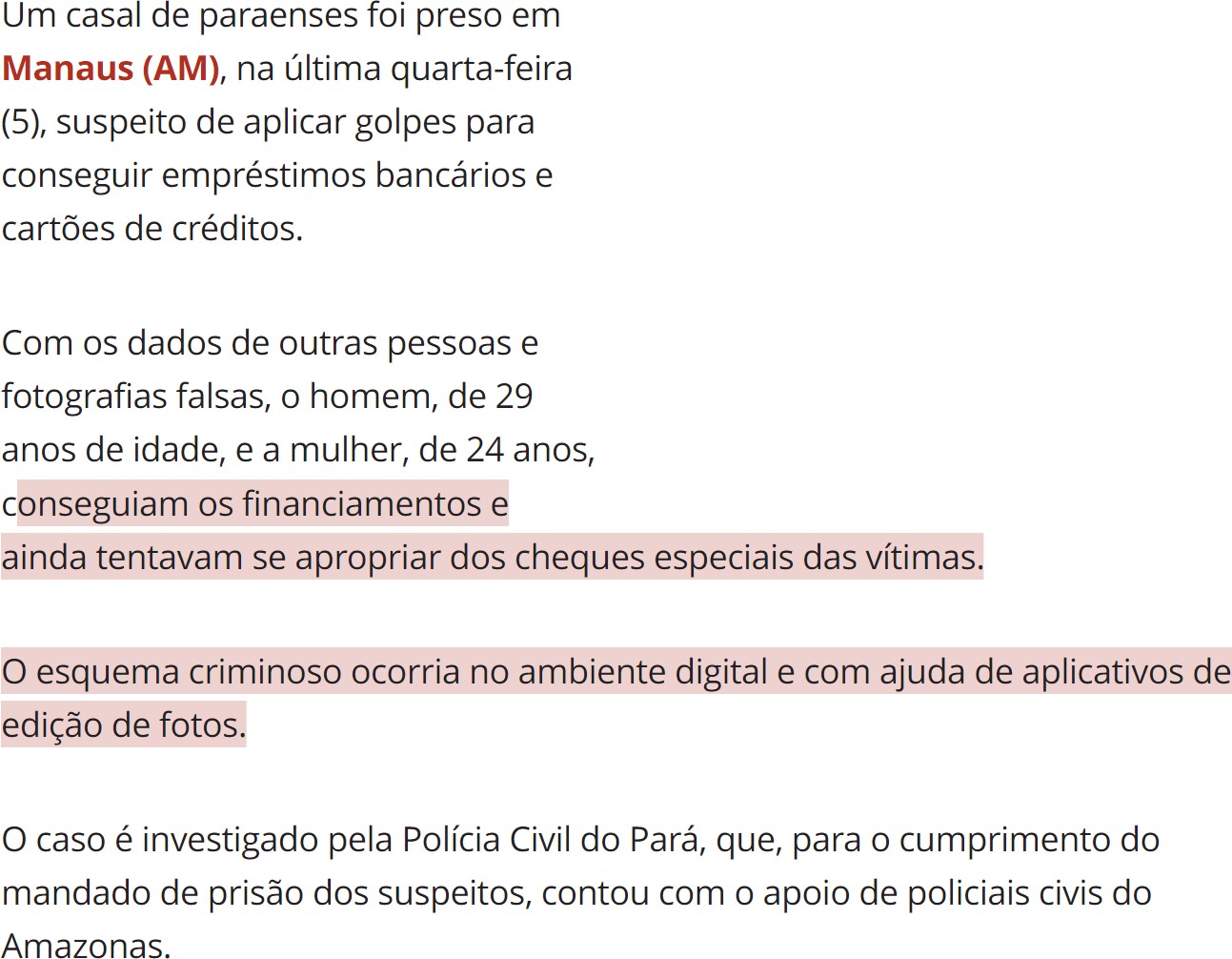 G1. Casal de paraenses que aplicava golpes para obter empréstimos bancários é preso em Manaus [online]. Publicado em 06 de junho de 2024.