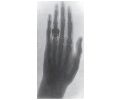 Wilhelm Conrad Roentgen, ao conduzir experimentos com uma ampola de Crookes em um ambiente escuro, observou luminescência em uma placa de platinocianeto de bário que estava distante, após passar uma corrente elétrica por ela (Francisco et al., 2005). Ele repetiu o experimento várias vezes, movendo a placa para longe do tubo de descarga e colocando diferentes objetos entre o tubo e a tela. Notou que materiais como chumbo e platina bloquearam a luminescência da tela, enquanto outros materiais não. Observou ainda, ao segurar objetos entre o tubo e a tela, os ossos de sua própria mão sendo reproduzidos na tela. Após substituir a tela fluorescente por uma chapa fotográfica, Roentgen convenceu sua esposa, Anna Bertha Roentgen, a participar de seus experimentos, resultando na primeira radiografia da história - a imagem dos ossos da mão de Anna Bertha Roentgen, incluindo seu anel de casamento (Lima, Afonso, Pimentel, 2009; Santos, Dias, Silva, 2021).