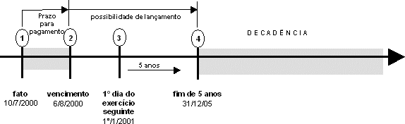 No exemplo abaixo, a decadência impede que o fisco faça o lançamento a partir do ponto 4, ou seja, a partir de primeiro de janeiro de 2006.