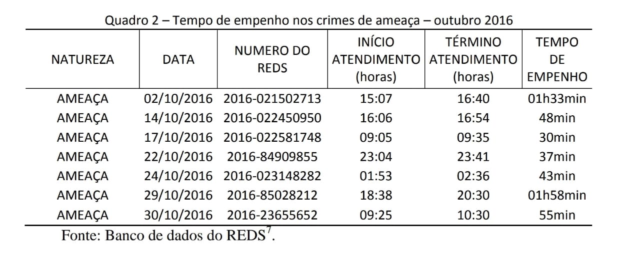 No primeiro quadro será apresentado o crime de ameaça, crime de menor potencial ofensivo, no qual é lavrado o TCO. O tempo de empenho demonstrado nesse quadro é anterior a implementação TCO pela PMMG.