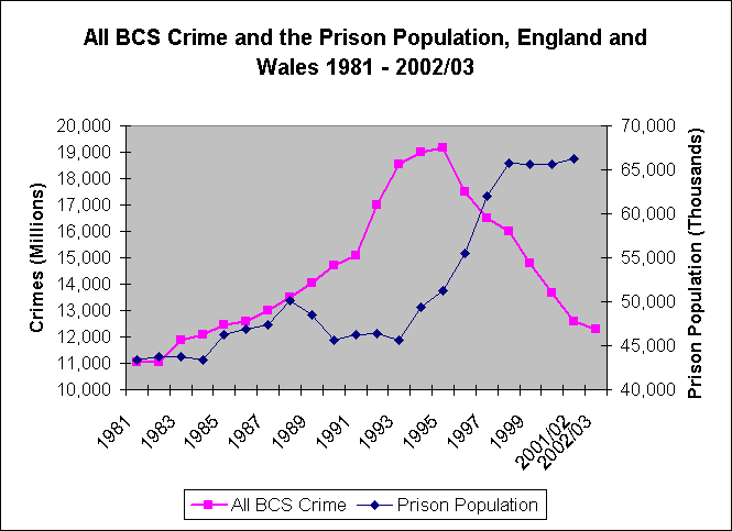 O professor David Green demonstra que a relação entre prisão de criminosos e diminuição de crimes parece bastante direta, como demonstrado pelo British Crime Survey (BCS), em dados que vão de 1981 a 2003.