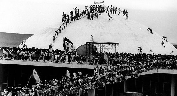 Com uma luta do regime para se manter, há o surgimento de novos atores: grevistas, sindicalistas, que trazem parte das vontades populares para o cenário político. Nesse contexto de embate, é convocada a Assembleia Constituinte. Apesar de haver uma predominância do PMDB, ela se deu de forma muito plural, ocorrendo “debaixo para cima”, havendo várias subcomissões que passariam seus projetos para oito comissões temáticas, que, por sua vez, passariam ao Plenário. O medo do regime anterior fez com que a assembleia, por mais que fosse conservadora em sua maioria, aprovasse ideias muito à frente do tempo e com forte participação popular, contando com manifestações indígenas e seus anseios por autonomia e das domésticas e sua busca por maior direitos, por exemplo, além do fato do povo poder mandar cartas ao governo com ideias e terem uma certa influência nas comissões temáticas. As imagens abaixo retratam a participação popular e como ela se deu de forma emblemática, especialmente no aspecto do povo escalando o congresso, como se a política voltasse a pertencer a eles.