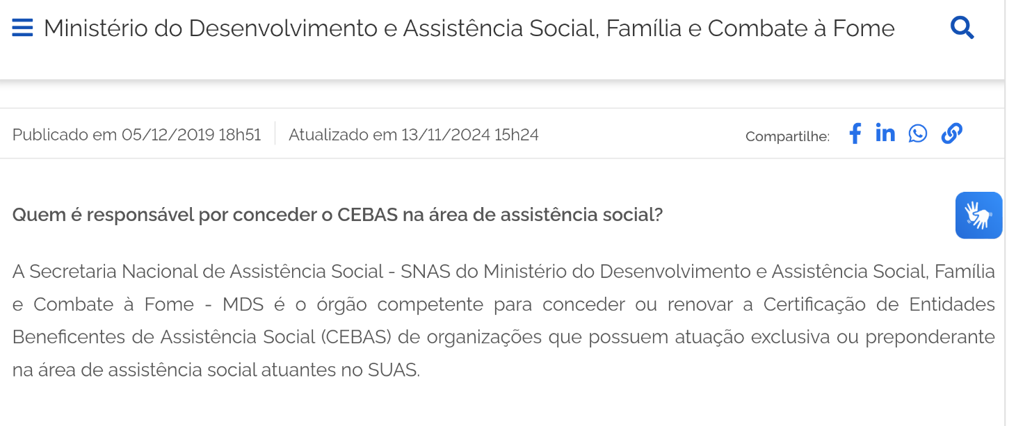 Fonte: Página do MDS: “Certificação de Entidades Beneficentes de Assistência Social”. Link: https://www.gov.br/mds/pt-br/acoes-e-programas/suas/entidades-de-assistencia-social/certificacao-de-entidades-beneficentes-de-assistencia-social-cebas (Brasil, 2024-A)