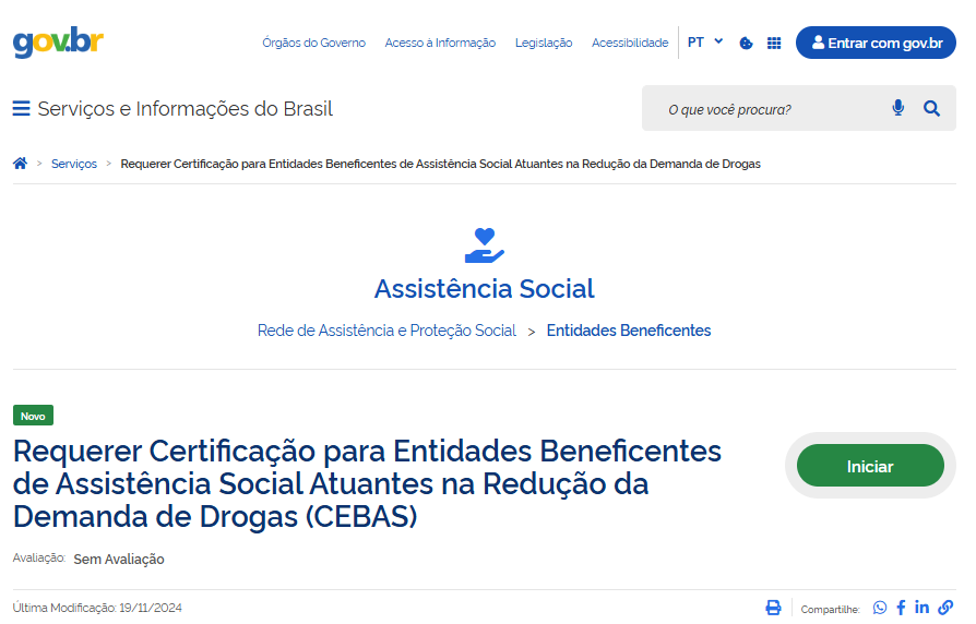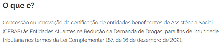 Fonte: Página do MDS: “Requerer Certificação para Entidades Beneficentes de Assistência Social Atuantes na Redução da Demanda de Drogas (CEBAS)”. Link: https://www.gov.br/pt-br/servicos/requerer-certificacao-para-entidades-beneficentes-de-assistencia-social-atuantes-na-reducao-de-demandas-de-drogas-cebas-senapred (Brasil, 2024-B)