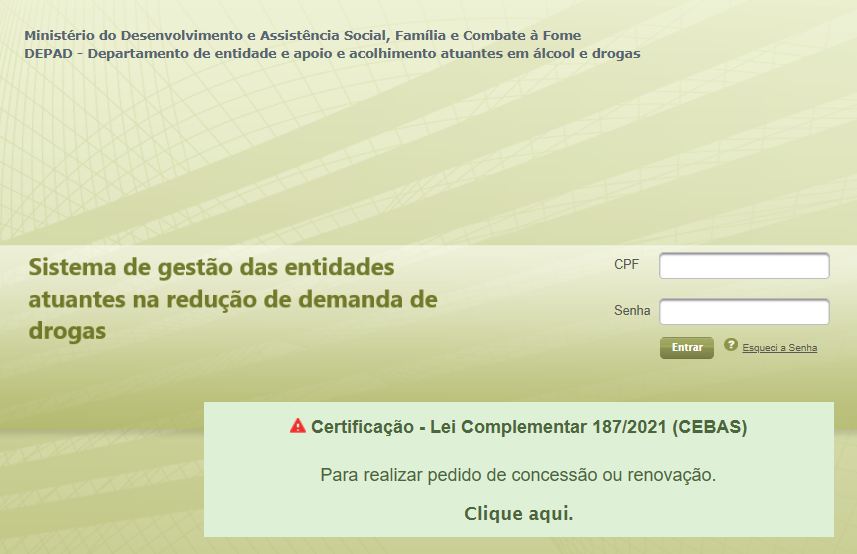 Inclusive, existe uma regulamentação específica para o procedimento de requerimento da concessão e renovação do CEBAS destas entidades, representada pela Portaria MDS nº 962, de 21/02/2024 (CEBAS – Redução de Demandas de Drogas), como também um sistema específico (Sistema de Gestão da Entidades Atuantes na Redução de Demandas de Drogas) sob a responsabilidade do Departamento de Entidades de Apoio e Acolhimento Atuantes em Álcool e Drogas (DEPAD) do MDS.