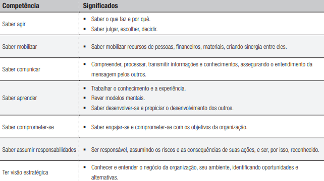 No Brasil, Maria Teresa Fleury e Afonso Fleury (2001) propõem um conceito considerado por eles como, ao mesmo tempo, abrangente e preciso. Para os autores, competência é “um saber agir responsável e reconhecido, que implica mobilizar, integrar, transferir conhecimentos, recursos, habilidades, que agreguem valor econômico à organização, e valor social ao indivíduo” (p. 21). Tais saberes e seus significados estão explicitados no quadro 1.
