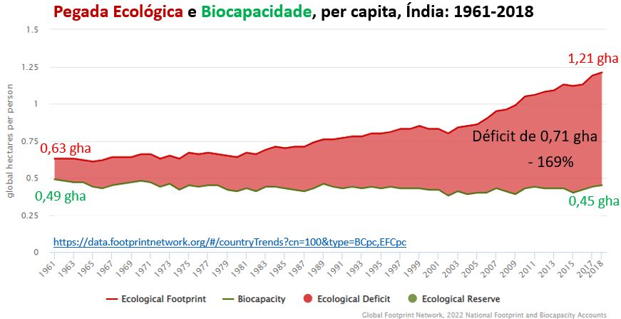 Gráfico 02: Pegada ecológica e biocapacidade per capita, Índia (1961-2018)