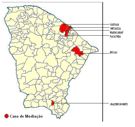 O mapa logo abaixo, mostra os municípios do Estado do Ceará que realizavam mediação há quase 20 anos atrás. Os municípios de Caucaia, Maracanaú, Pacatuba, Russas e Juazeiro do Norte já tinham casas de mediação comunitária vinculadas à Secretaria de Justiça e Cidadania do Estado do Ceará.