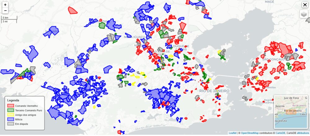 Assim sendo, nesse período as milícias cresceram 204,6%, triplicando o seu domínio territorial. E, na oportunidade, as facções criminosas com o Comando Vermelho e o Terceiro Comando Puro cresceram 88,2% e 78,1%, respectivamente. Um outro lado alarmante informa que dos 155,33 km quadrados de área da cidade dominada por algum grupo armando em 2023, 62,2% estavam sob o comando das milícias em 2023. Porquanto, o Comando Vermelho (CV), o Terceiro Comando Puro (TCP) e Amigos dos Amigos (ADA) concentram 20,7%, 9,3 % e 2,4%, respectivamente.
