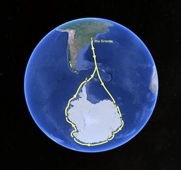 Mapa: Rota da Circum-Navegação: Equipe de Cientistas percorreu mais de 20 mil km da Costa do Continente Antártico. Crédito de Imagem: UFRGS128.