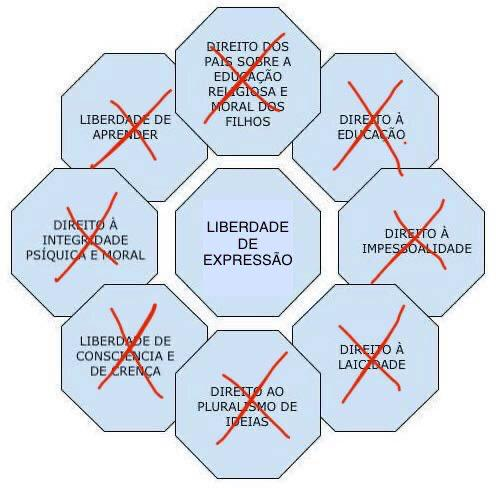 O professor não possui liberdade de expressão em sala de aula; possui liberdade de ensinar, que é função pública regulada por princípios constitucionais e deveres funcionais. Se tivesse liberdade de expressão, poderia não ministrar aula, violando direitos fundamentais dos alunos e dos pais — como ilustra o diagrama abaixo (Imagem 2), no qual se demonstra que tal “liberdade” poderia suprimir direitos como a educação, a neutralidade, a impessoalidade, a integridade psíquica e moral, a laicidade, a liberdade de consciência e de crença, a liberdade de aprender e o pluralismo de ideias.