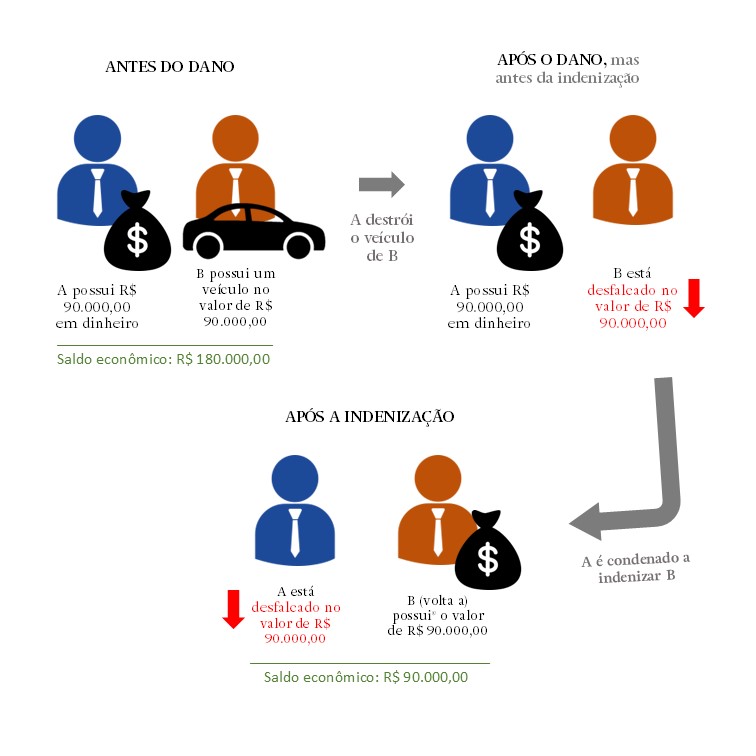 A comparação entre o estado pré-dano e o estado pós-indenização não deixa dúvidas: o dano possui uma eficácia destrutiva de valor econômico, e o desequilíbrio ocasionado pelo ofensor não é restabelecido. Isso não causa maiores impressões no leitor, que pode até se perguntar “e daí?”, e essa pergunta reflete o que pensamos a respeito da responsabilidade civil intuitivamente: esse desequilíbrio econômico, agora transferido ao ofensor, é irrelevante. E é irrelevante porque o ofensor é culpado pelo dano, então a atribuição desse desequilíbrio econômico ao ofensor é justificada. Num raciocínio semelhante, mas com conclusão diversa Vicenzo Roppo menciona que é característico da função reparatória satisfazer o ofendido (indivíduo), mas que não satisfaz a sociedade como um todo. O motivo é que, agora, o bem destruído foi efetivamente subtraído das disponibilidades econômicas totais, como se todos nós tivéssemos empobrecido, no processo. Defende que a função que melhor atende aos interesses de toda a sociedade é a função preventiva da responsabilidade civil, veja: