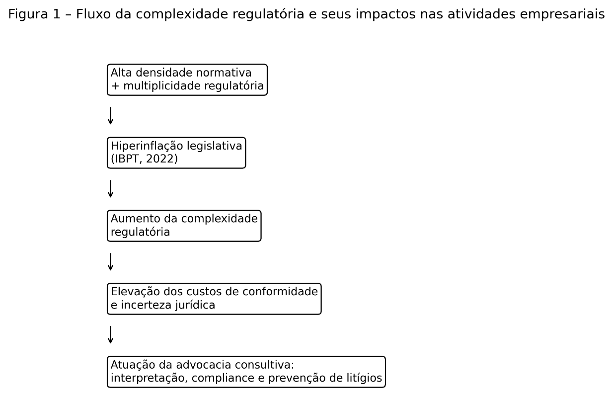 A relação entre complexidade normativa, aumento de custos e necessidade de atuação preventiva pode ser visualizada de forma sistemática na Figura 1, que representa o encadeamento entre densidade regulatória, custos de conformidade e riscos jurídicos.