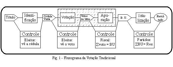 Tentando eliminar todos os focos de fraude identificados pelo Ministro Velloso o TSE decidiu juntar as três primeiras etapas de uma eleição - a identificação, a votação e a apuração - num único local e equipamento: a urna eletrônica brasileira10 e a figura 2 apresenta o fluxograma de dados e controles da sua implementação.