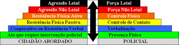 A apostila de Uso Legal da Força, fornecida pelo Ministério da Justiça (2006), após analisar diversos tipos de modelos de uso da força, e recomendar o modelo canadense, propõe a adoção de um modelo básico de uso progressivo da força: