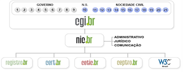 Como já visto, inicialmente a IANA, e depois a ICANN (2011), atribuiu ao Comitê Gestor da Internet no Brasil a responsabilidade pelo ccTLD brasileiro. O mesmo fez o Decreto 4.829/2003. Contudo, por meio da Resolução-CGI 1/2005, o CGI.br delegou ao Núcleo de Informação e Coordenação do Ponto Br – NIC.br, uma associação privada, a execução do registro de nomes de domínio, a alocação de endereços IP e a administração dos domínios sob o “.br” (art. 1º). Pelo disposto na Resolução, o NIC.br deve se sujeitar às regras estabelecidas pelo CGI.br (art. 2º) e cobrar valores pela execução do registro de nomes de domínios mediante aprovação do Comitê Gestor (art. 3º), entre outras atribuições.
