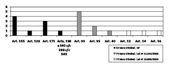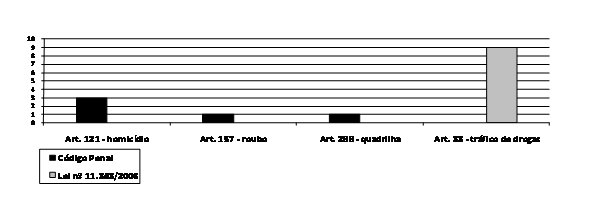Com base na consulta realizada, constatou-se que a maioria dos processos que apresentavam situação semelhante à descrita neste trabalho encontrava-se relacionada aos crimes previstos na Lei de Tóxicos, confirmando os resultados obtidos por outros pesquisadores, alguns dos quais apontados em capítulo anterior, de acordo com a seguinte composição: