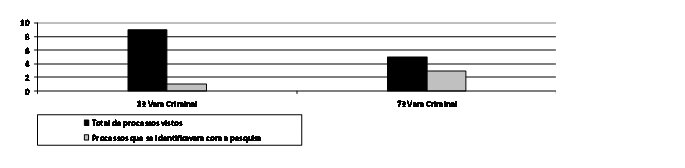 Os critérios utilizados para seleção dos processos foram: denunciado pertencente ao gênero feminino e processos já sentenciados. Foram vistos 09 (nove) processos na 3ª Vara Criminal, para onde são distribuídos processos variados, de crimes como roubo a homicídio, e 05 (quatro) processos na 7ª Vara Criminal, para onde são distribuídos os processos relacionados às substâncias entorpecentes.