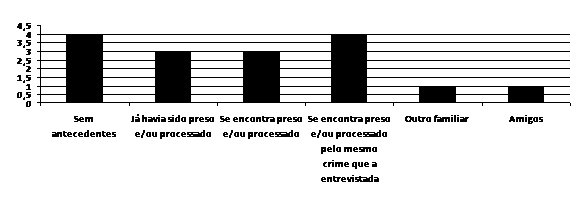 Das entrevistadas, apenas duas já tinham sido presas e processadas antes, uma pelo crime de furto (art. 155, do CP), com pena ainda não cumprida, e a outra por homicídio (art. 121, CP), sendo reincidente no mesmo crime. Observa-se, deste modo, que as mulheres entrevistadas não tinham um comportamento criminoso reiterado, tendo se envolvido com o crime de forma pontual. Necessário esclarecer se este envolvimento se deu em razão da dependência afetiva, a fim de verificar a procedência das informações colhidas.