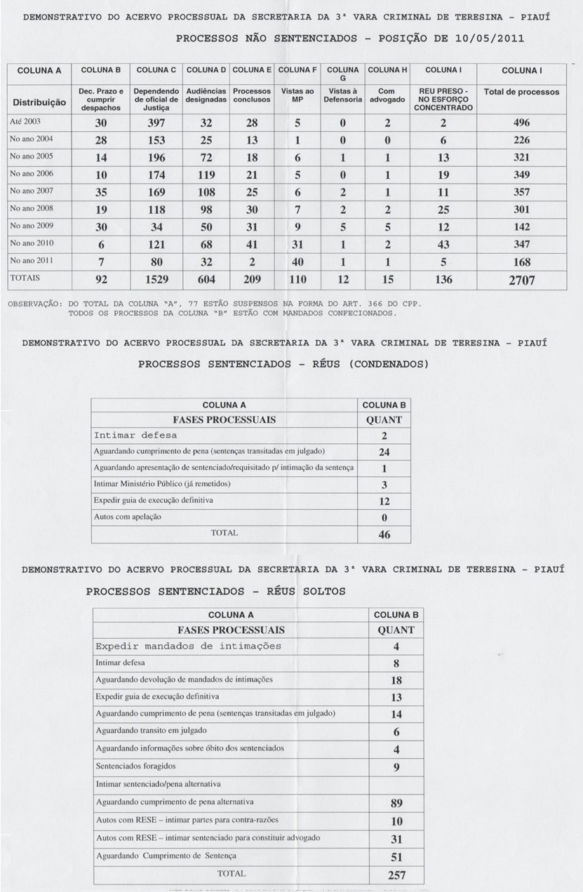 Conforme “Demonstrativo do acervo processual da secretaria da 3ª Vara Criminal de Teresina – Piauí” (Imagem 1), atualizado até 10 de maio de 2011, de um total de 2.707 (dois mil setecentos e sete) processos distribuídos, existiam 303 (trezentos e três) processos sentenciados (com réus presos e soltos). Não existiam dados relativos a quantidade de processos em que os réus eram mulheres. Dessa forma, foram analisados todos os processos já sentenciados que foram encontrados. O Diretor da Secretaria da 3ª Vara, Otávio Soares da Silva, confirmou que o número de processos em que apareciam mulheres como autoras de crimes eram muito poucos.