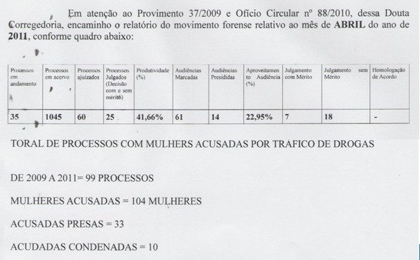 Segundo relatório do movimento forense relativo ao mês de abril (Imagem 2), a 7ª Vara Criminal contava com um total de 1.045 (mil e quarenta e cinco) processos, sendo que, destes, 25 (vinte e cinco) haviam sido julgados. Dos anos de 2009 a 2011, existem na 7ª Vara Criminal 99 (noventa e nove) processos com mulheres acusadas por tráfico de drogas, com um total de 104 (cento e quatro) mulheres acusadas, sendo que, destas, 33 (trinta e três) encontram-se presas e, ainda, apenas 10 (dez) foram condenadas. Quanto a estes processos, da 7ª Vara Criminal de Teresina, foram vistos apenas 05 (cinco) processos, em razão da especificidade dos processos em tramitação nesta vara, razão pelas quais as situações verificadas acabarem por se repetir.