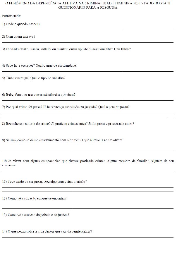Diante da concordância, foi pedido que cada uma delas assinasse Termo de Livre Consentimento Esclarecido. As entrevistas não puderam ser gravadas, em razão da falta de autorização da Diretora da Penitenciária, mas as respostas relevantes foram transcritas, de acordo com o questionário elaborado (Imagem 3). O questionário era do tipo perguntas fechadas e respostas abertas, de forma que não induzisse qualquer resposta por parte das entrevistadas.