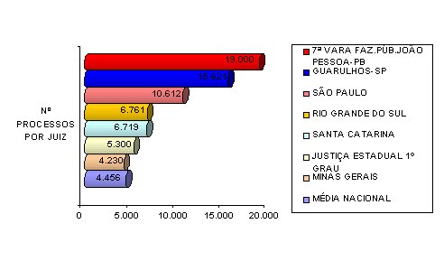 Esses dados gerais impressionam, pois, por si só, já revelam a dificuldade do exercício da magistratura brasileira. Entretanto, algumas comarcas apresentam uma desproporção muito maior. Citem-se dois exemplos: Nas 29 Varas do Fórum de Guarulhos-SP tramitam aproximadamente 453 (quatrocentos e cinquenta e três) mil processos. Levando-se em conta que cada Vara conta com um juiz, o número que se obtém é de aproximadamente 15.621 (quinze mil e seiscentos e vinte e um) processos por juiz. Em Guarulhos, quase 1000 (mil) processos são distribuídos todos os dias60. O segundo exemplo é o da 7ª Vara da Fazenda Pública de João Pessoa - PB, onde existem cerca de 19 (dezenove) mil ações para um só juiz61.