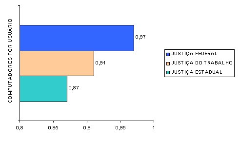 Fala-se disso porque, infelizmente, o número atual de computadores existentes no Poder Judiciário ainda é insuficiente para uma completa aplicação do processo eletrônico no Brasil. Também de acordo com os dados do Conselho Nacional de Justiça62, conta-se atualmente com menos de 01 (um) computador por servidor. O índice referente ao total de computadores por usuário mostra-se desta forma: a Justiça Federal aponta 0,97; na Justiça do Trabalho 0,92 e na Justiça Estadual o total é de 0,87 computadores por usuário. Apenas alguns Estados têm o privilégio de oferecer um computador ou mais para os seus usuários. É o caso de Amapá (1,00), Amazonas (1,06), Distrito Federal (1,08), Espírito Santo (1,00), Rio Grande do Sul (1,14) e Santa Catarina com 1,16 computadores por usuário.